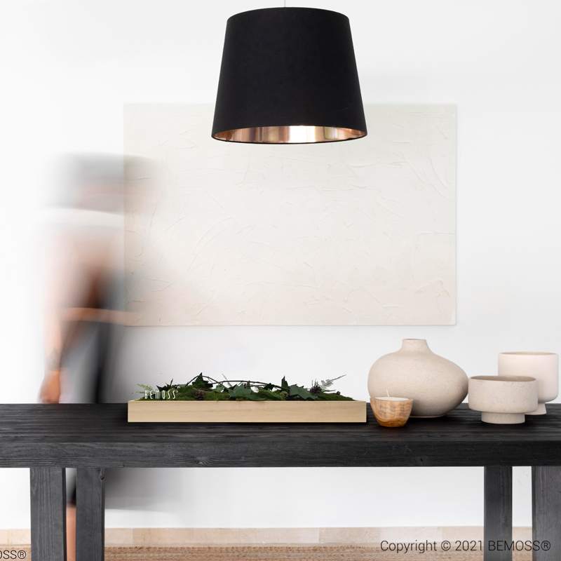Alle Produkte von BEMOSS® werden handgefertigt in Deutschland. Moosbilder und Mooswände bestehen aus 100 % natürlichem Material, das durch ein spezielles Verfahren in einer Stabilisierungslösung konserviert wurde. Dadurch sind alle Moosbilder, Mooswände und stabilisierten Pflanzen pflegefrei – sie benötigen weder Tageslicht noch Wasser zum Erhalt. Die Lebensdauer der Moosbilder und -wände von BEMOSS® beträgt mehrere Jahre. Um diese möglichst lange zu bewahren, ist Folgendes entscheidend:
