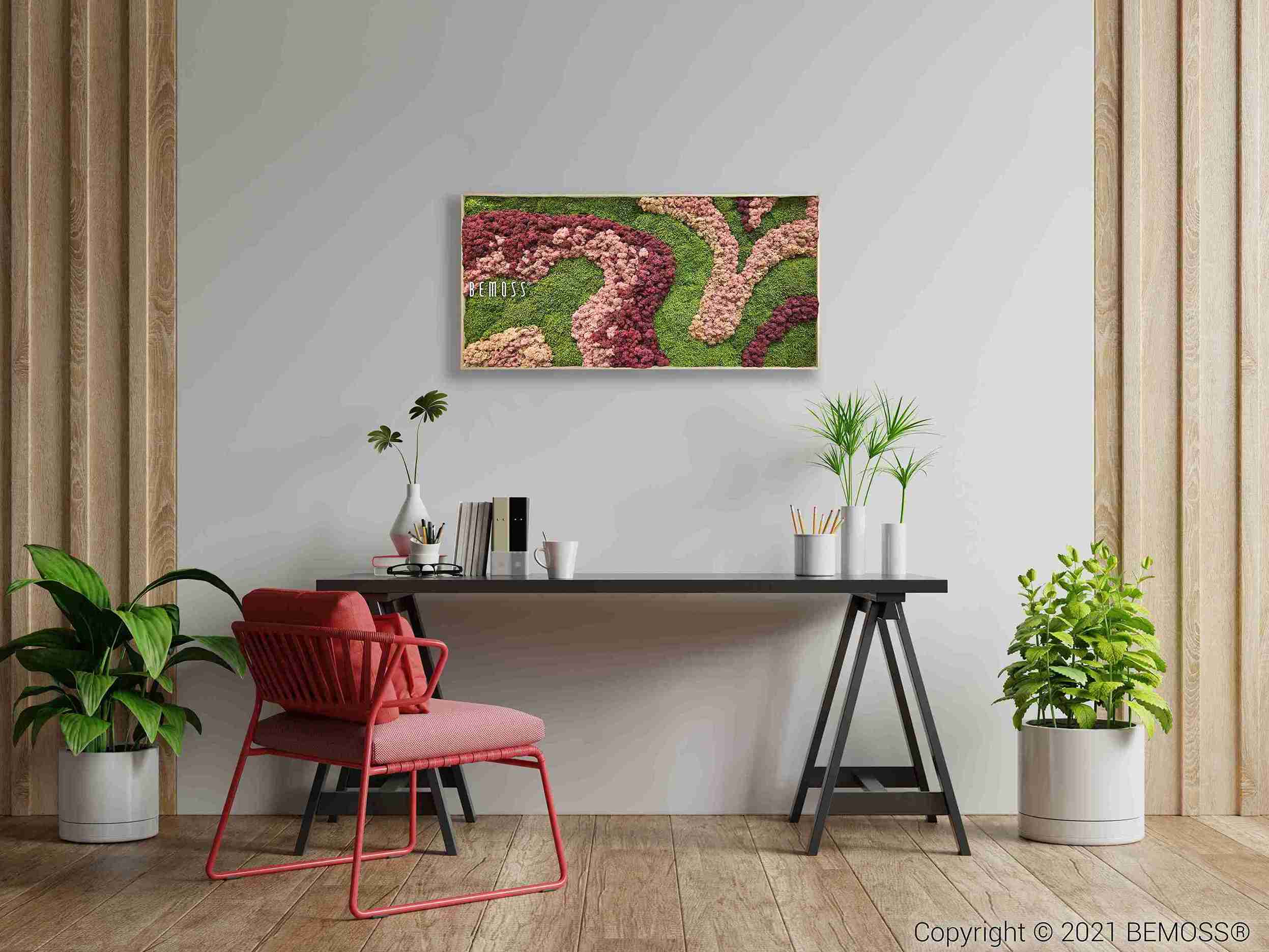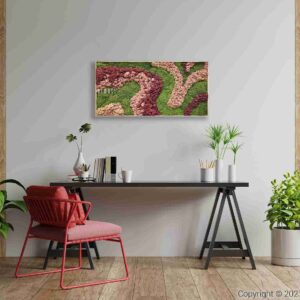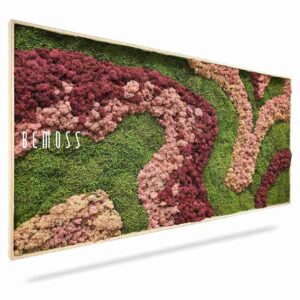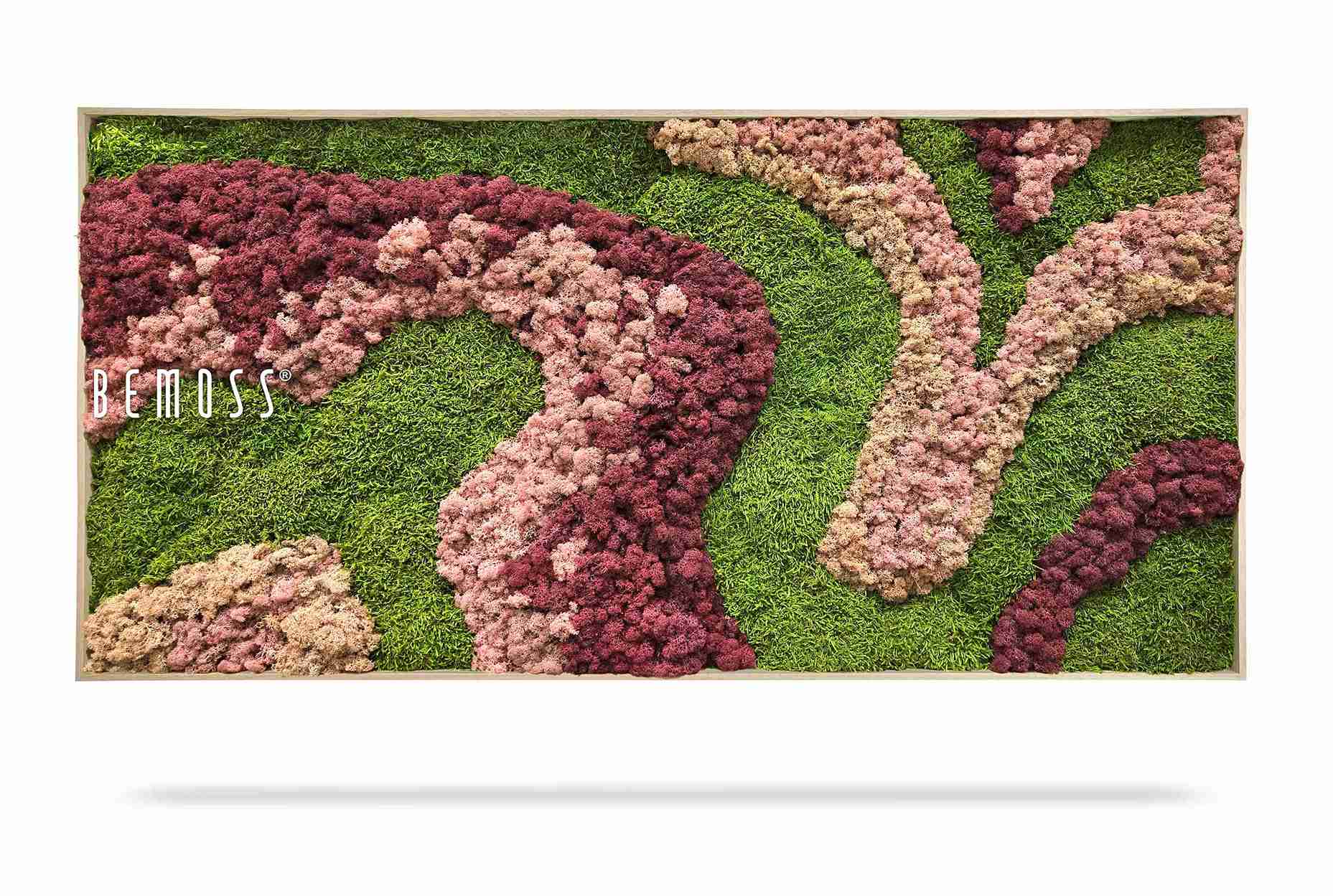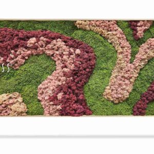 Moosbild BEMOSS® ORTHO ARROSA vereint Natur und Design in einer einzigartigen künstlerischen Form. Die Basis des Bildes besteht aus einem kräftig grünen Moos, das frisch und natürlich wirkt. Dynamische Linien in Rosa- und Bordeaux-Tönen durchziehen die gesamte Komposition und schaffen einen faszinierenden Kontrast, der an Flussmäander oder Landschaften aus der Vogelperspektive erinnert. Diese Farbkombination strahlt Harmonie und Sanftheit aus und wirkt zugleich elegant und luxuriös.