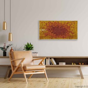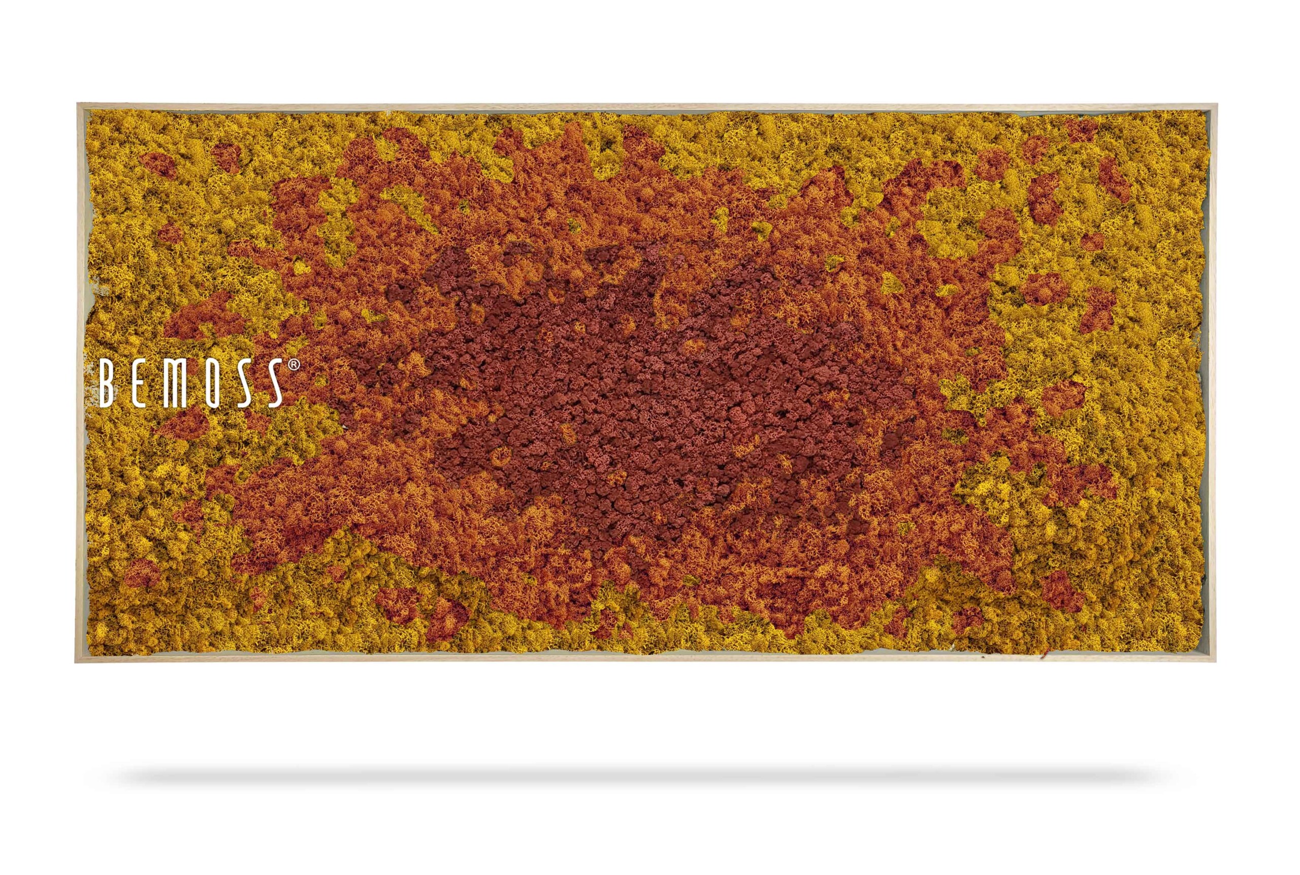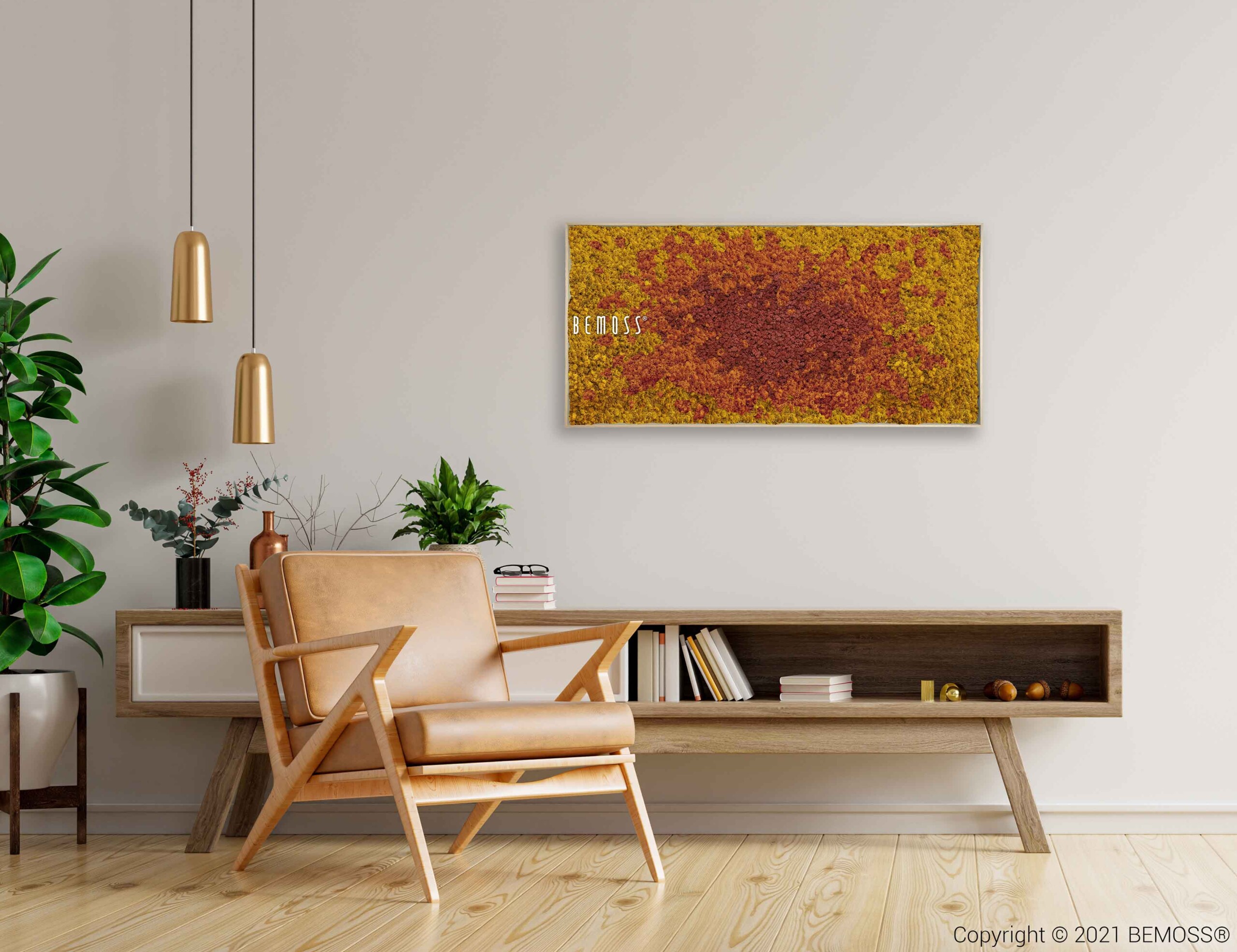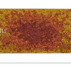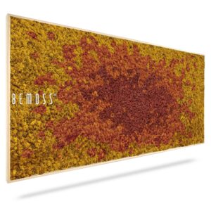 Moosbild BEMOSS® SPLASH Sienna fängt die Essenz des Herbstwaldes ein. Das dynamische Zusammenspiel von sattem Rot, senfgelbem und sanft orangefarbenem Moos erinnert an Wirbel von Laub im Licht der untergehenden Sonne. Stabilisiertes Moos, das in diesem Kunstwerk verwendet wird, ist nicht nur ästhetisch, sondern auch äußerst praktisch. Es benötigt keine Pflege, wodurch seine Schönheit über Jahre hinweg erhalten bleibt.