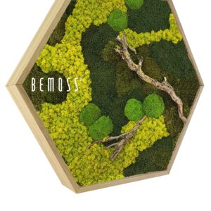 Das Moosbild Hexagon BEMOSS® ORTHO BORJA ist ein wunderschönes Beispiel dafür, wie Natur stilvoll in den Innenraum integriert werden kann. Dieses einzigartige Bild kombiniert satte grüne und leuchtend gelbe Moosfarben mit authentischen Zweigen, die den Eindruck eines Waldes direkt in Ihr Zuhause bringen. Die dynamische Anordnung von Farben und Texturen fügt dem Raum Harmonie und natürlichen Charme hinzu.