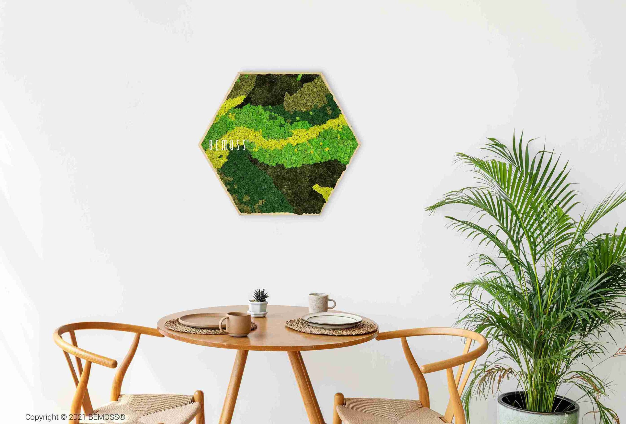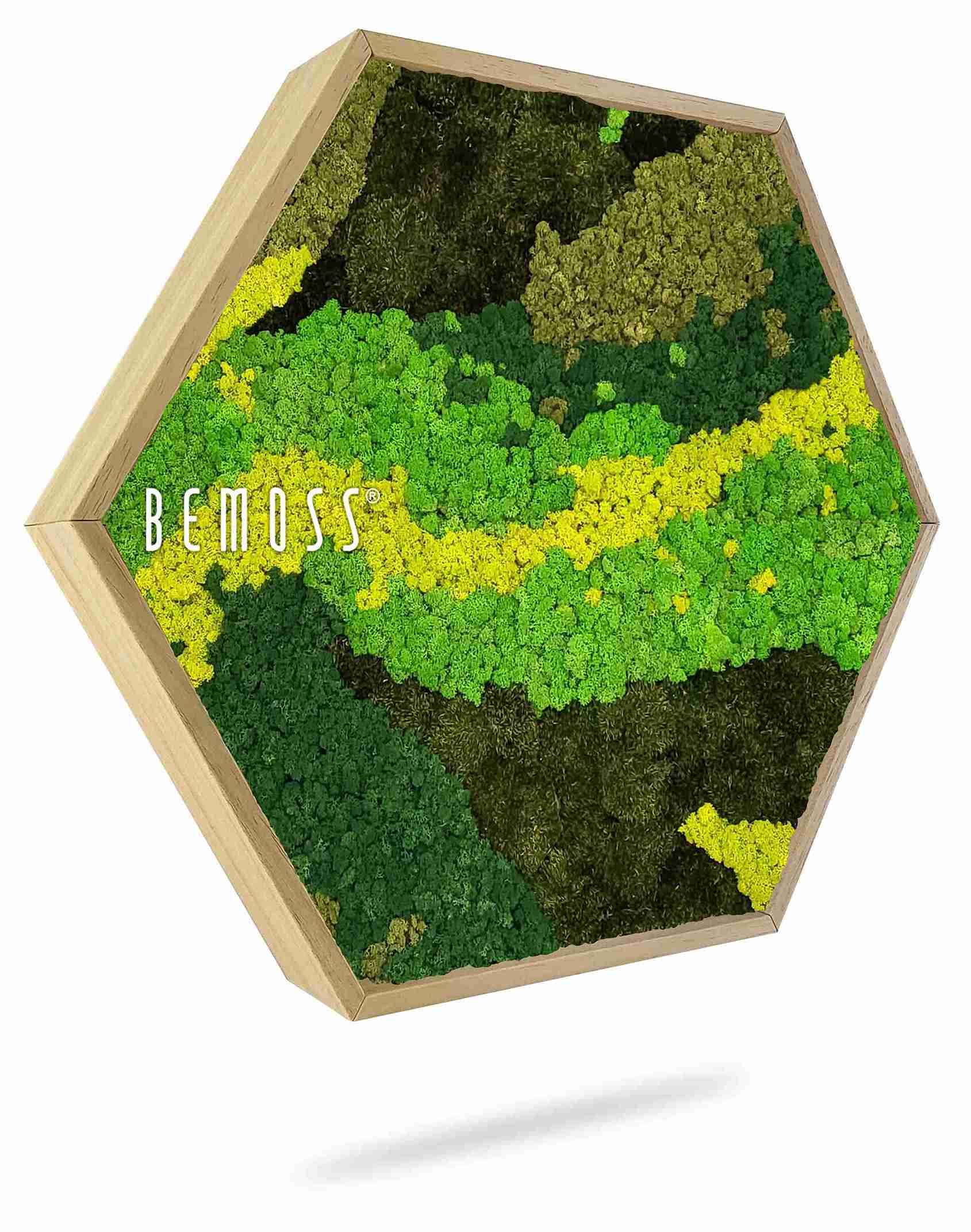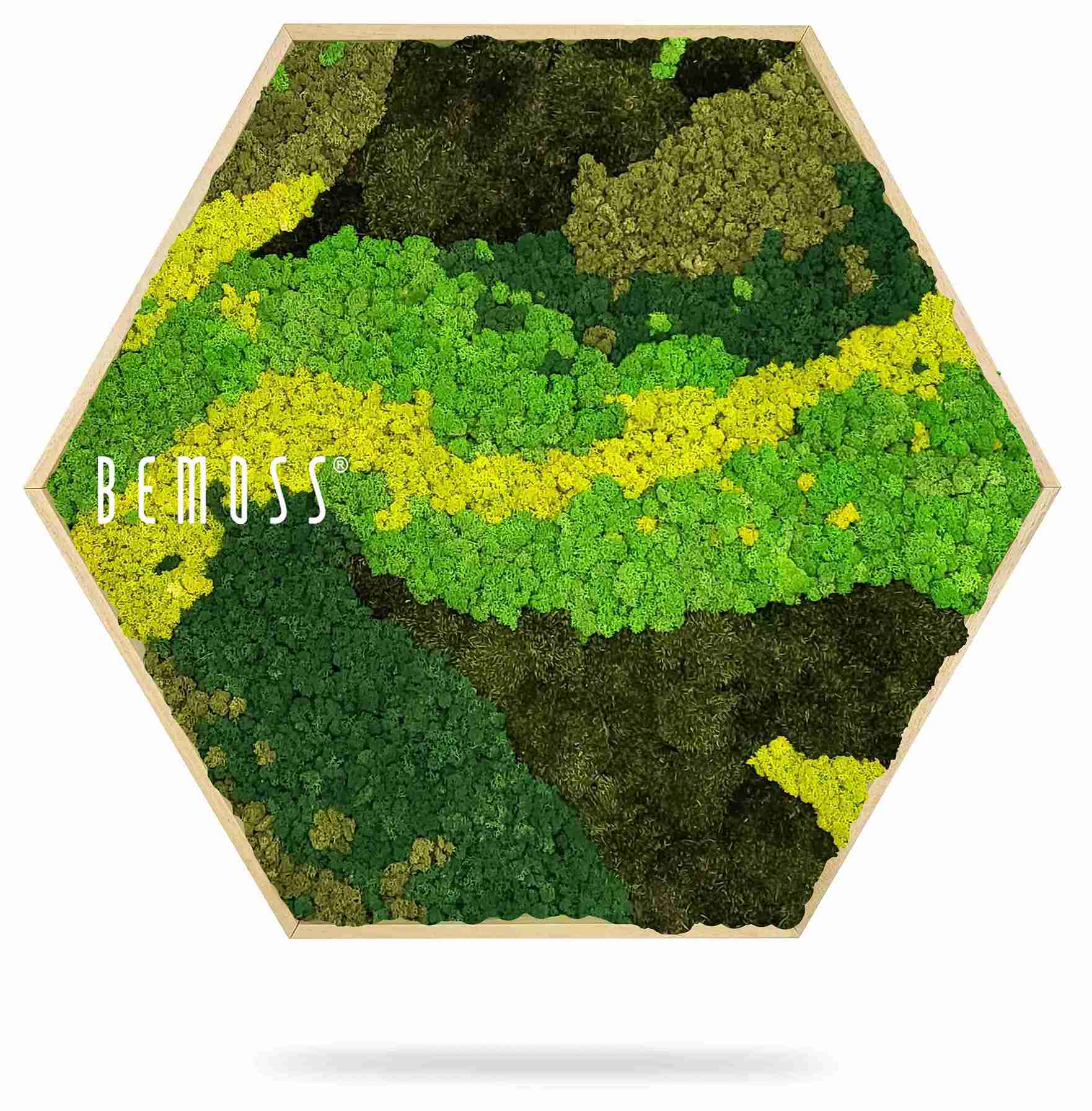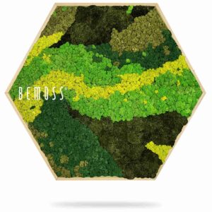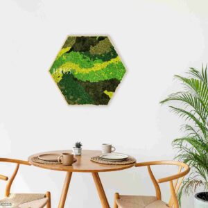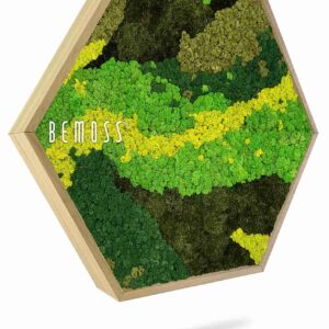 Das Moosbild Hexagon BEMOSS® ORTHO CARROT bringt die Frische der Natur in Ihr Interieur, mit sorgfältig zusammengestellten Grüntönen und gelbem Moos. Die organischen Linien schaffen eine verspielte, aber harmonische Komposition, die sowohl in modernen als auch klassischen Räumen passt. Dieses Design ruft ein Gefühl von natürlicher Balance und Dynamik hervor, wobei es dennoch einen beruhigenden Eindruck bewahrt.