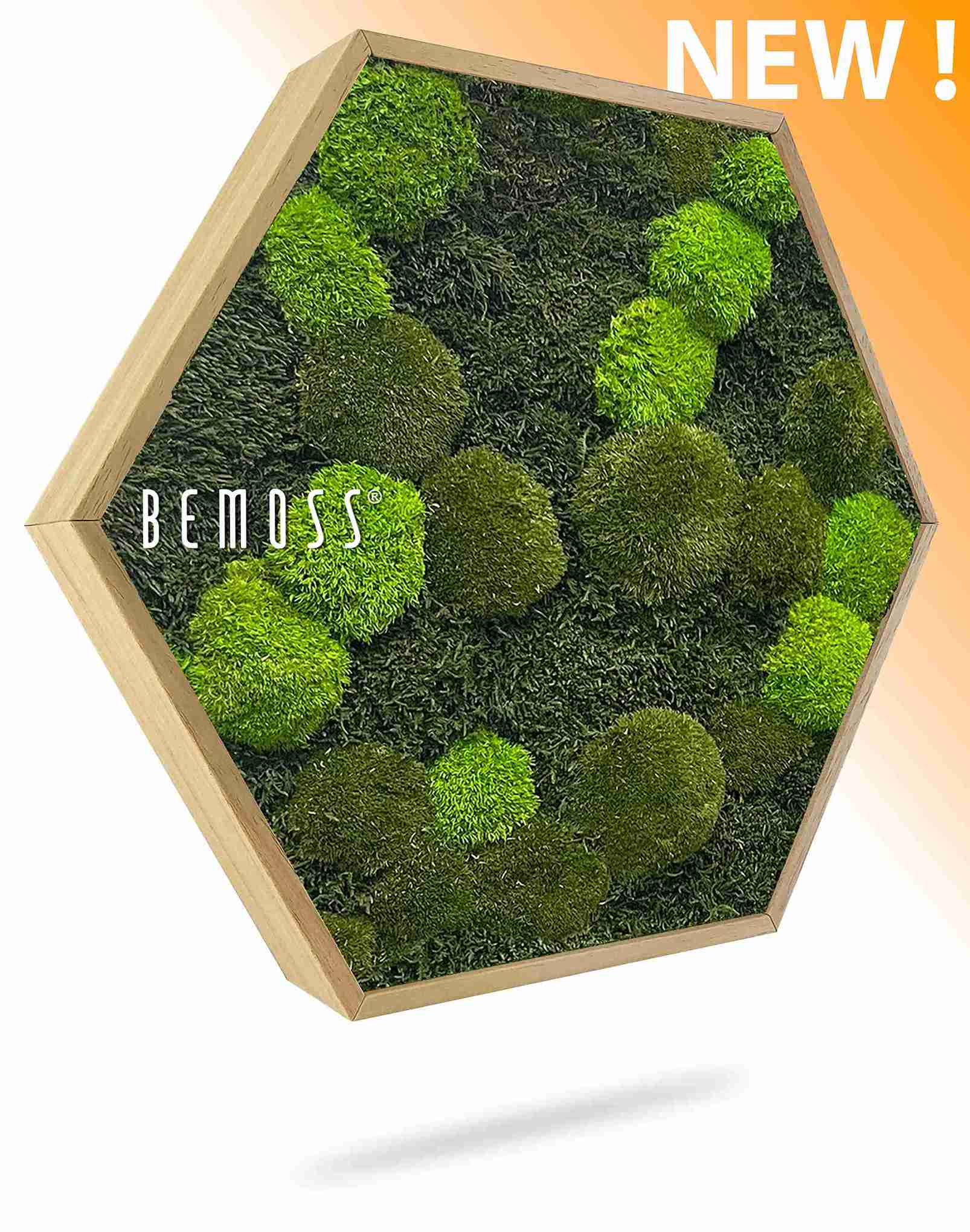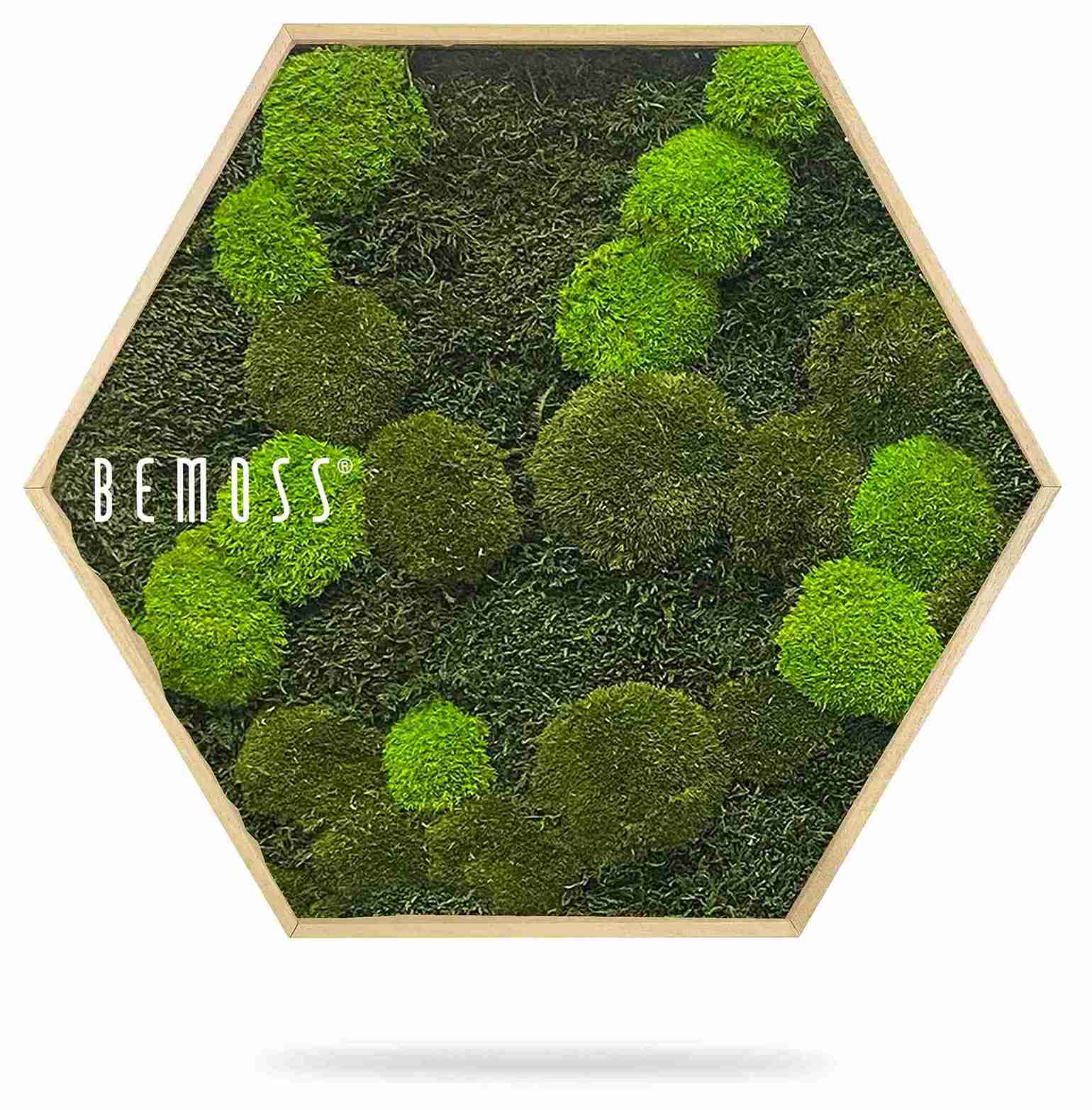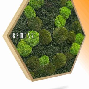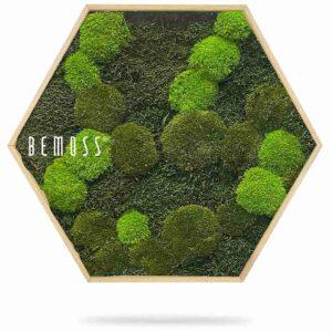Moosbild Hexagon FLACHMOOS & KUGELMOOS Doven mono überzeugt durch die Kombination aus unterschiedlichen Moosstrukturen in natürlichen Grüntönen. Die sechseckige Form bringt eine moderne, klare Linie in den Raum. Gefertigt aus 100% natürlichem stabilisiertem Moos, ist das Bild pflegefrei und handgefertigt in Österreich.